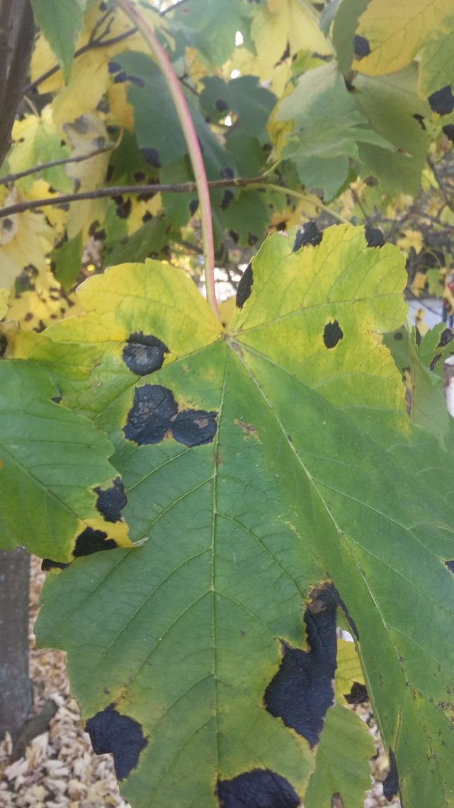 Черни петна върху листа от обикновен явор (Acer pseudoplatanus) край пътя над с. Горни Лозен Септември, 2019